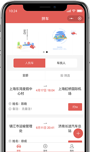 拼車(chē)模塊分車(chē)找人和人找車(chē)兩種模式,進(jìn)入小程序后用戶(hù)只需要輸入自己的具體位置和目的地,將信息進(jìn)行提交后,小程序會(huì)將發(fā)布信息上傳至平臺(tái),尋找相匹配的私家車(chē)或者乘客。